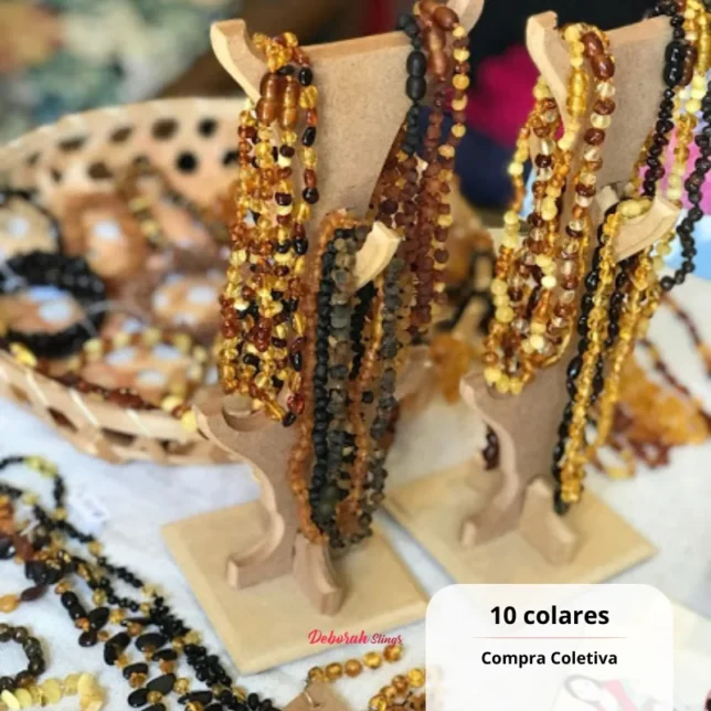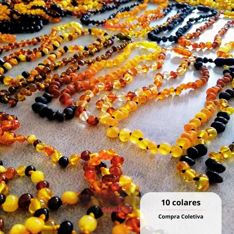No kit estão inclusos 10 colares de âmbar modelos sortidos conforme disponibilidade em estoque, 10 certificados de garantia, 10 certificados de autenticidade e 10 embalagens.